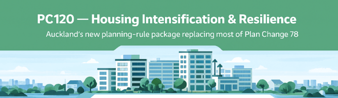 PC120, formally dubbed “Housing Intensification & Resilience”, is the new package of planning-rule changes that has replaced most of Plan Change 78 (PC78). It has been prepared under updated national legislation and aims to deliver the same overall dwelling-capacity ...